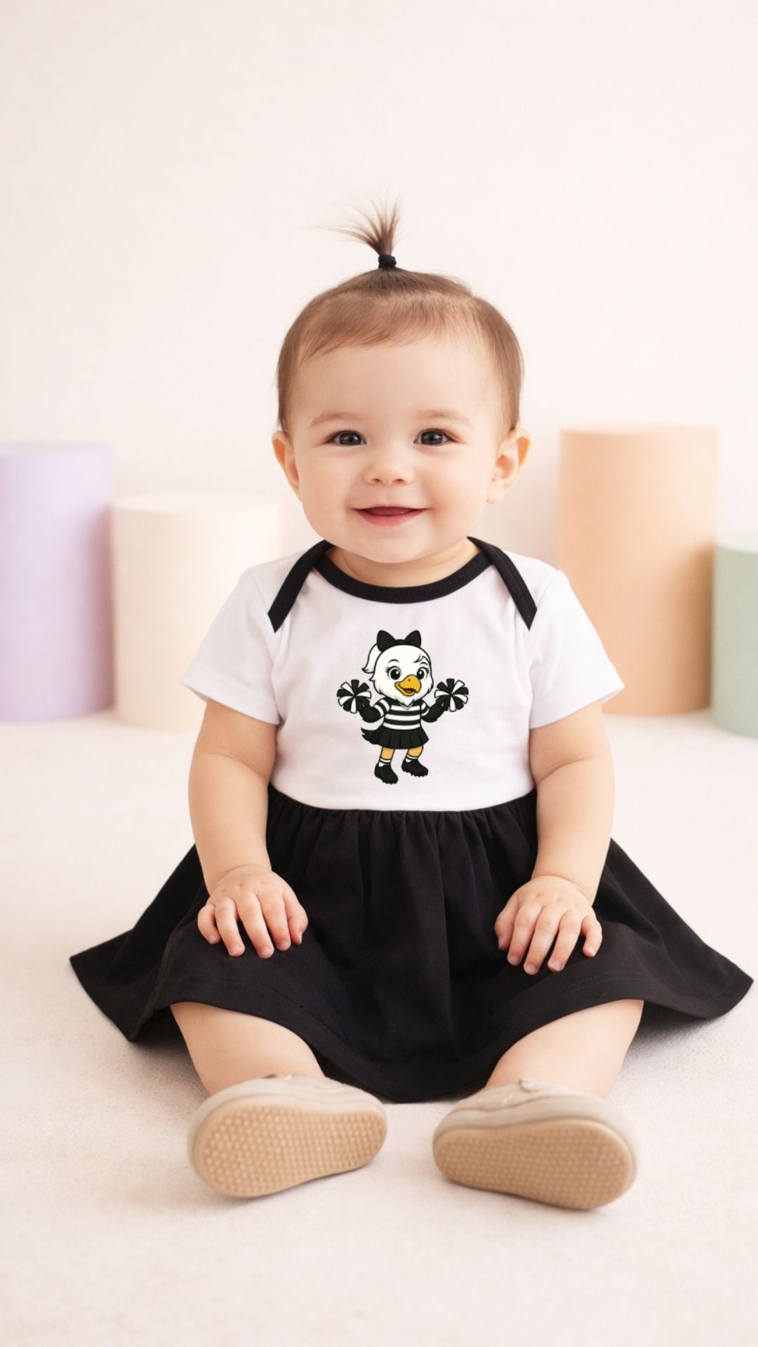 O Body Infantil Katitus Tema Futebol Preto e Branco com Saia Rodada é perfeito para as pequenas torcedoras que já nascem apaixonadas por futebol!