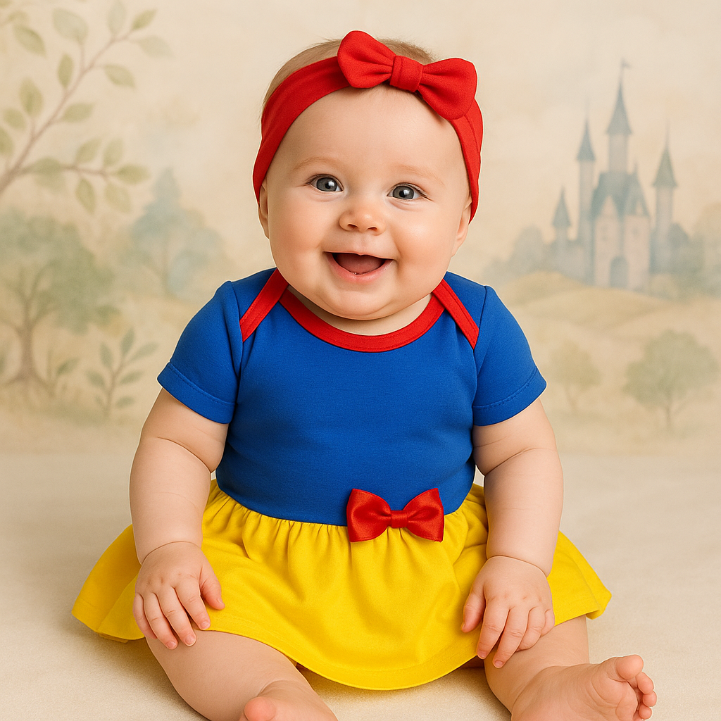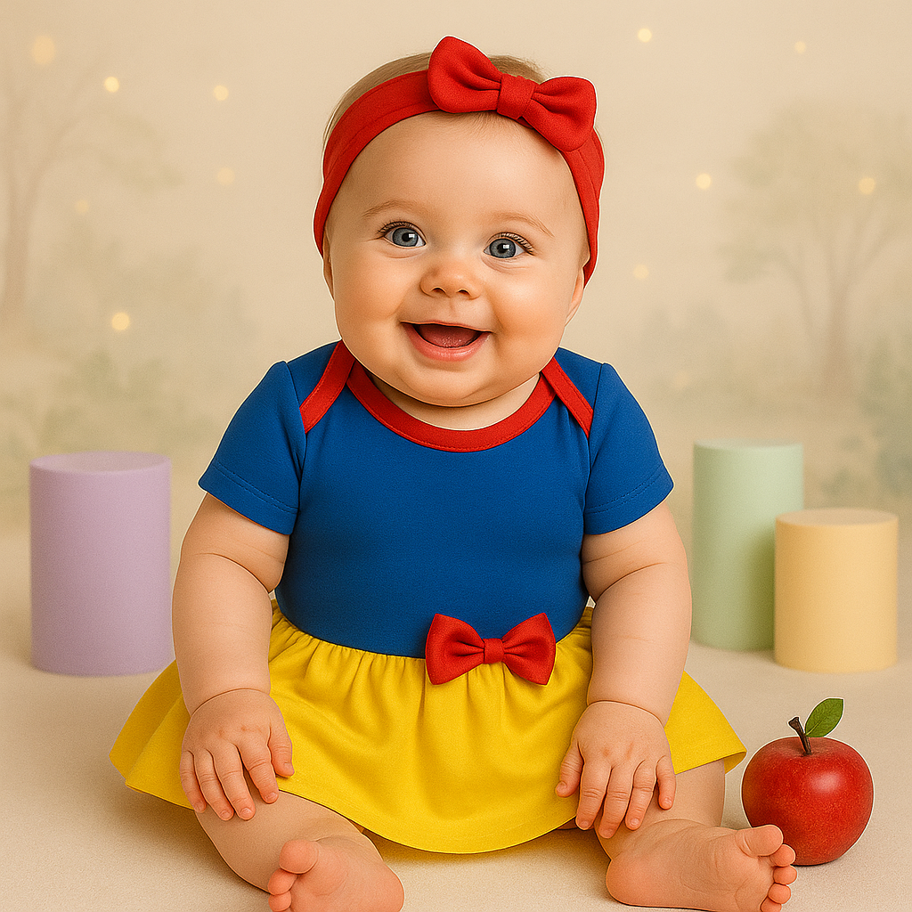 Encante nos momentos especiais com o body fantasia Branca de Neve para bebê! Inspirado na clássica princesa, é perfeito para mesversário, festa temática, ensaio fotográfico e fantasia infantil confortável. Com detalhes delicados e tecido macio, garante beleza e aconchego em cada clique.