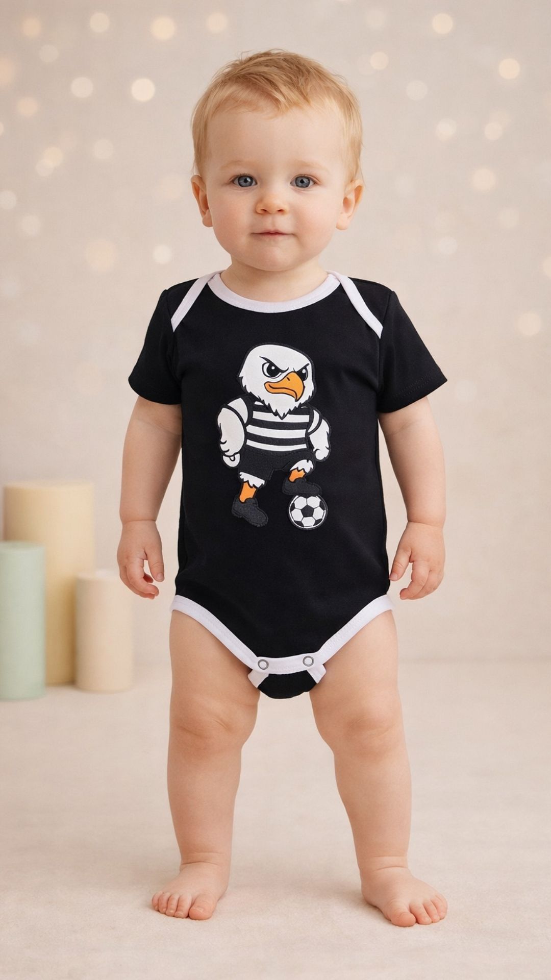 Com visual esportivo nas cores preto e branco, é perfeito para famílias apaixonadas por futebol que desejam vestir o bebê com um look temático, confortável e cheio de personalidade.