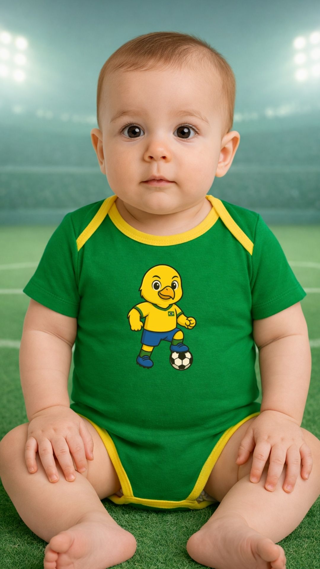 Com visual esportivo inspirado nas cores do futebol brasileiro, é perfeito para famílias apaixonadas por futebol que desejam vestir o bebê em datas especiais, jogos importantes, clima de Copa do Mundo ou simplesmente demonstrar desde cedo o amor pelo Brasil.