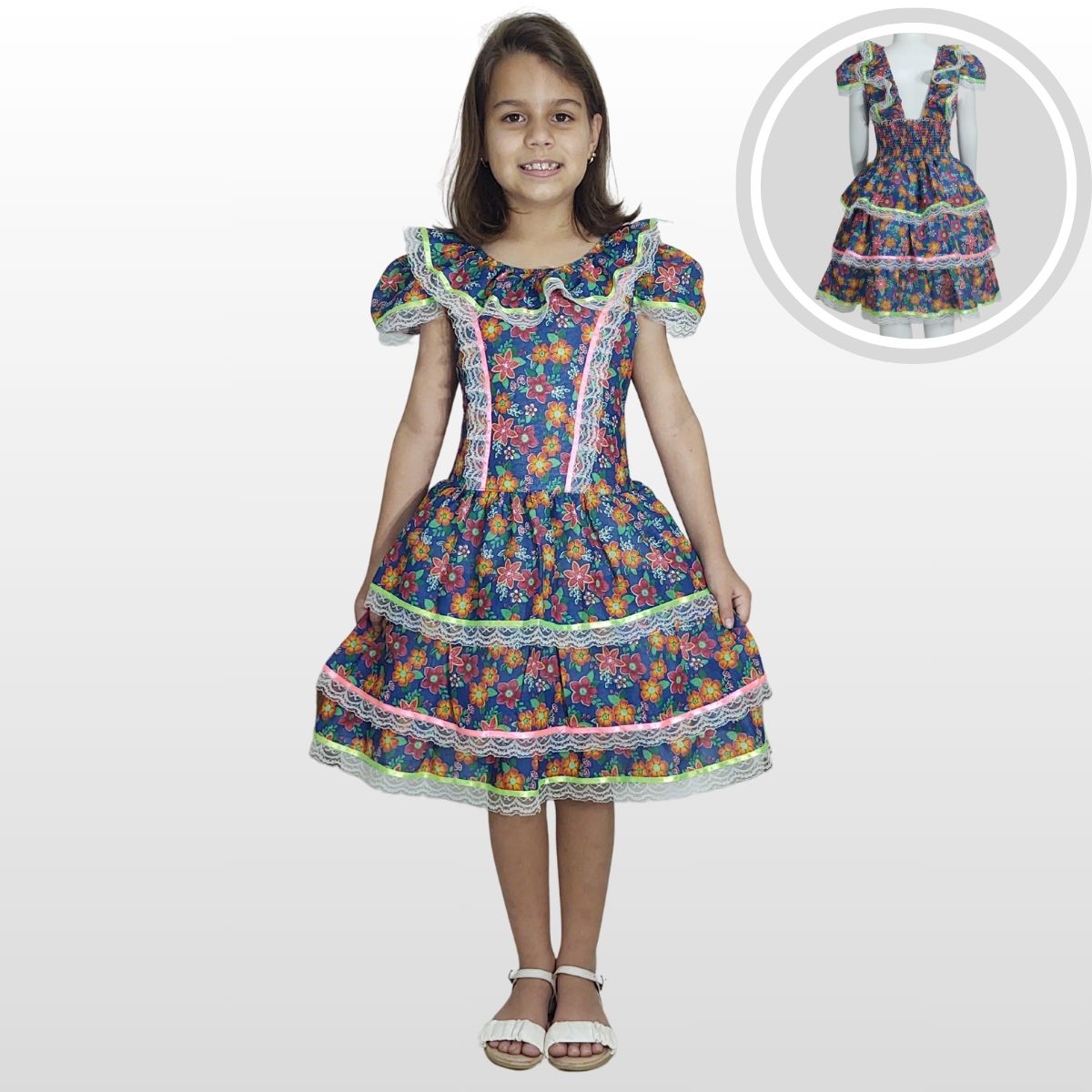 O vestido apresenta um estampado floral alegre e colorido, com babados, rendas e fitas delicadas que trazem o charme típico das festas juninas. O caimento rodado e as camadas da saia dão movimento e leveza à peça, tornando sua menina ainda mais encantadora!